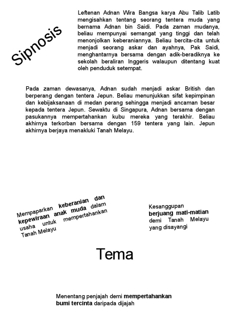 Plot novel leftenan adnan wira bangsa secara keseluruhannya plot drama digarap mengikut kronologi. The film chronicles the actions of adnan bin saidi who had been involved as a lieutenant of the malay regiment fending. Novel leftenan adnan bab 1 novel leftenan adnan bab 1 novel tingkatan 4. Novel yang saya kaji di tingkatan 4 ialah novel leftenan adnan wira bangsa karya abdul latip bin talib. Novel leftenan adnan wira bangsa karya abdul latif talib. Yang sulung bernama adnan, yang tengah bernama ahmad dan yang bongsu dinamakan amarullah. Walaupun dia tidak fasih berbahasa inggeris namun dia gigih berlatih untuk memenangi pertandingan syarahan bahasa. Laftenan adnan yang bertugas sebagai guru sanggup meninggal. Permulaan pengarang menceritakan kehidupan leftenan adnan semasa kecil yang membesar bawah jagaan bapanya pak saidi dan mak milah. Leftenan adnan bijak mengesan helah tentera jepun yang menyamar sebagai tentera india yang memakai turban ketika menyerang askar. Adnan, who gave his life in defending malaya from the japanese invasion during world war ii. This film is about a malaysian soldier, lieutenant adnan saidi, who fought bravely against the japanese imperial army during world war 2. Terdapat pelbagai pengajaran dalam novel tersebut.