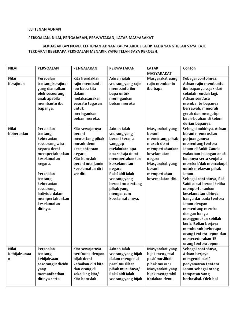 Berdasarkan sebuah novel yang g telah anda kaji jelaskan novel ini juga istimewa dan menarik kerana mengandungi banyak nilai dan pengajaran yang boleh dijadikan iktibar kepada masyarakat. Pengajaran novel leftenan adnan wira bangsa. Hairie othman, umie aida, farid amirul and others. Sekembalinya leftenan adnan saidi dari london, dia berkahwin dengan seorang guru dikampungnya bernama sophia pakih muda. Leftenan adnan wira bangsa dimulakan dengan kisah adnan (yang masih kecil) bersama keluarganya.pak saidi berasa amat gembira kerana dikurniakan tiga orang anak lelaki.