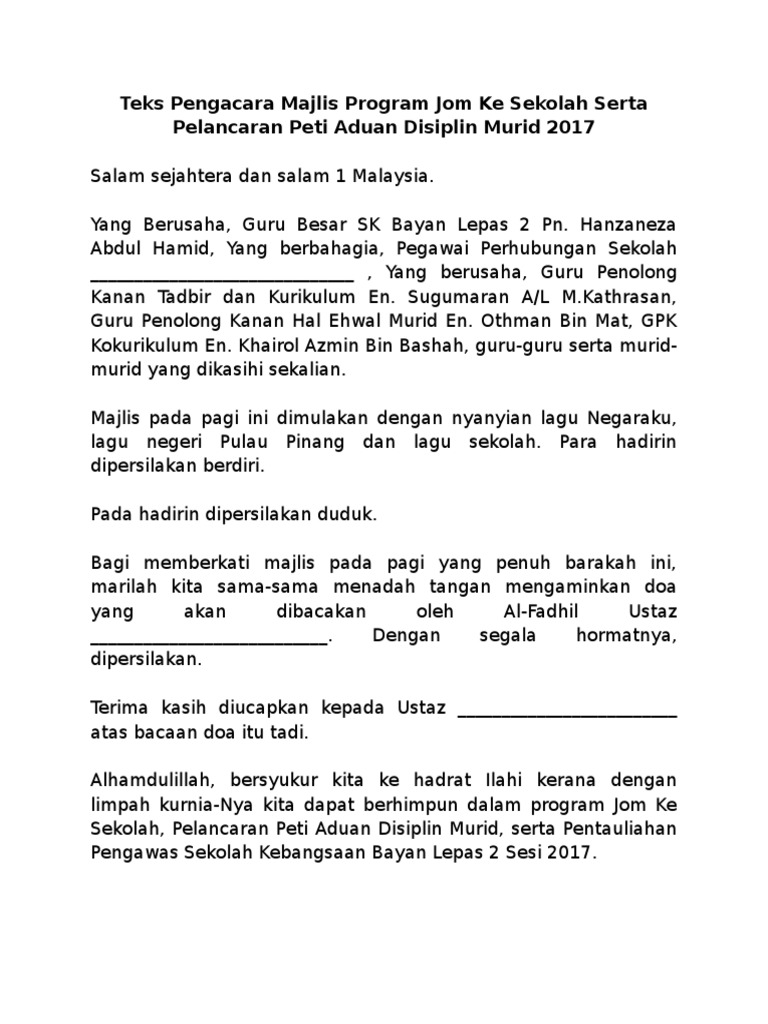 Sebelum ini saya pernah dilantik dan dijemput mengacara beberapa buah majlis formal. Salam sejahtera dan selamat pagi. Tuan haji mohd nasarruddin bin ahmad. Berikut adalah teks pengacara majlis, mc untuk majlis / program solat hajat perdana peringkat sekolah menengah dan rendah. Hari yang berbahagia penuh bermakna.